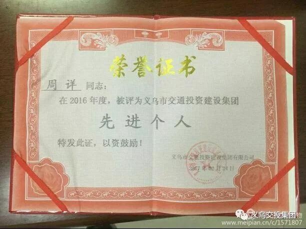 交投集团2016年度先进个人荣誉证书